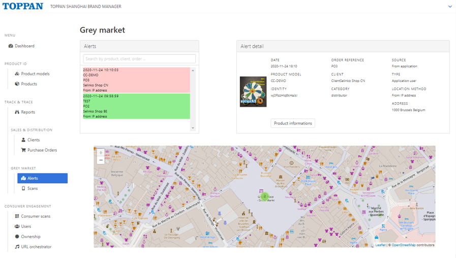 - Protects brands against gray market distribution by detecting a product's location through consumer scans.