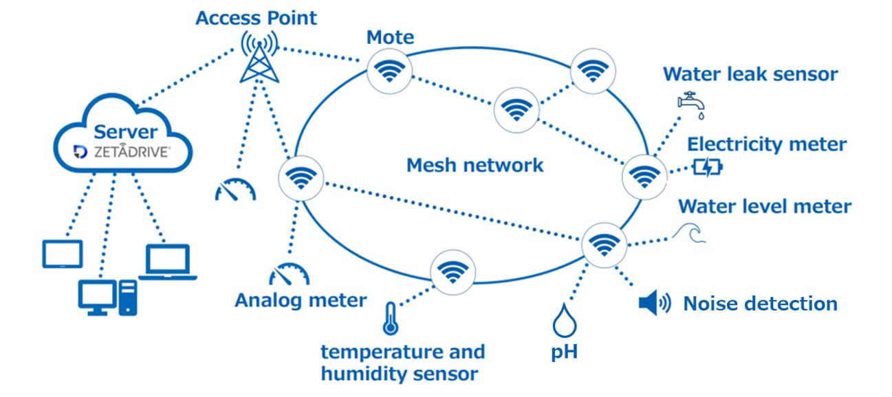 Multi-hop mesh network can relay communications from distant sensors, expanding the communication area at low cost. Even if the connection to the access point is lost, communication can be maintained by detouring among several repeaters.