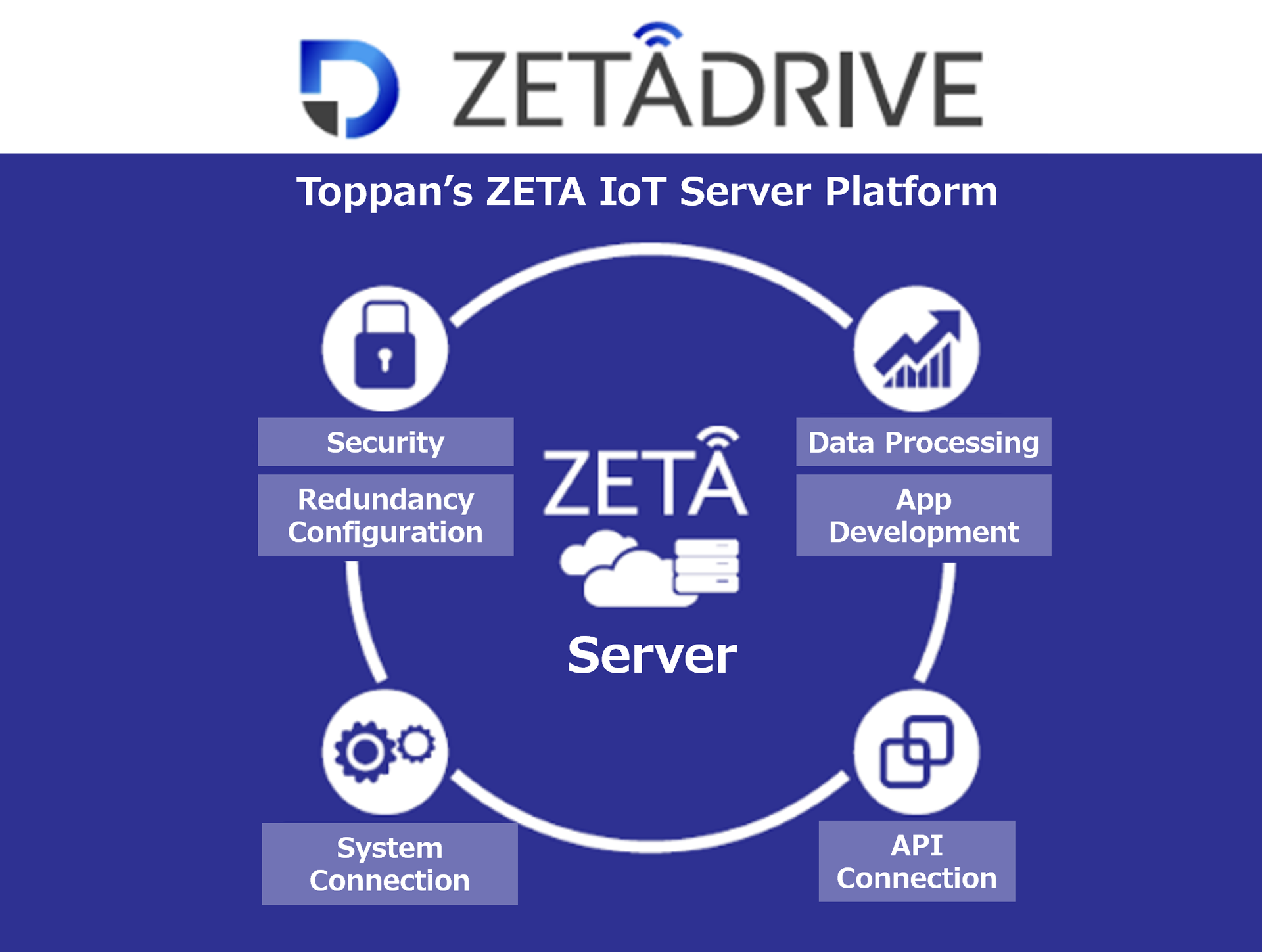 ZETADRIVE is a platform service combined of servers required for ZETA networks and an app capable of visualizing data collected by ZETA. ZETA servers for device management are set up in the cloud by leveraging Toppan’s know-how regarding the development and operation of digital services, as well as its high-level security infrastructure. In addition, the sensor data browsing system can be used to handle everything comprehensively from gathering and managing data to visualizing it. Using APIs for functions like data acquisition and device control, systems and applications can also be integrated according to specific needs.
