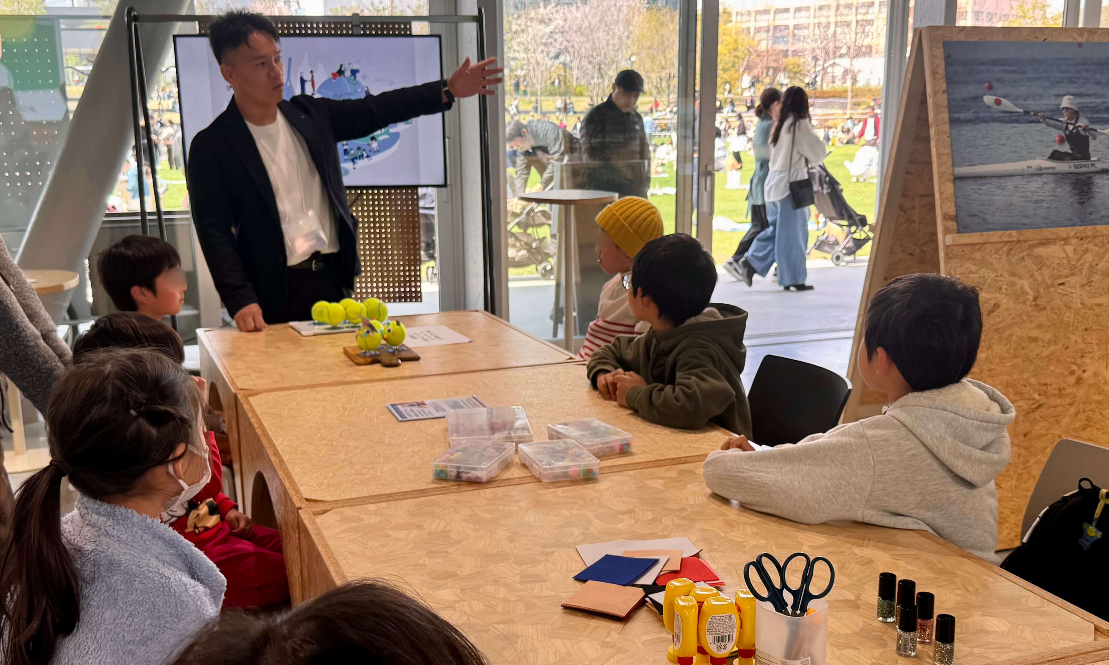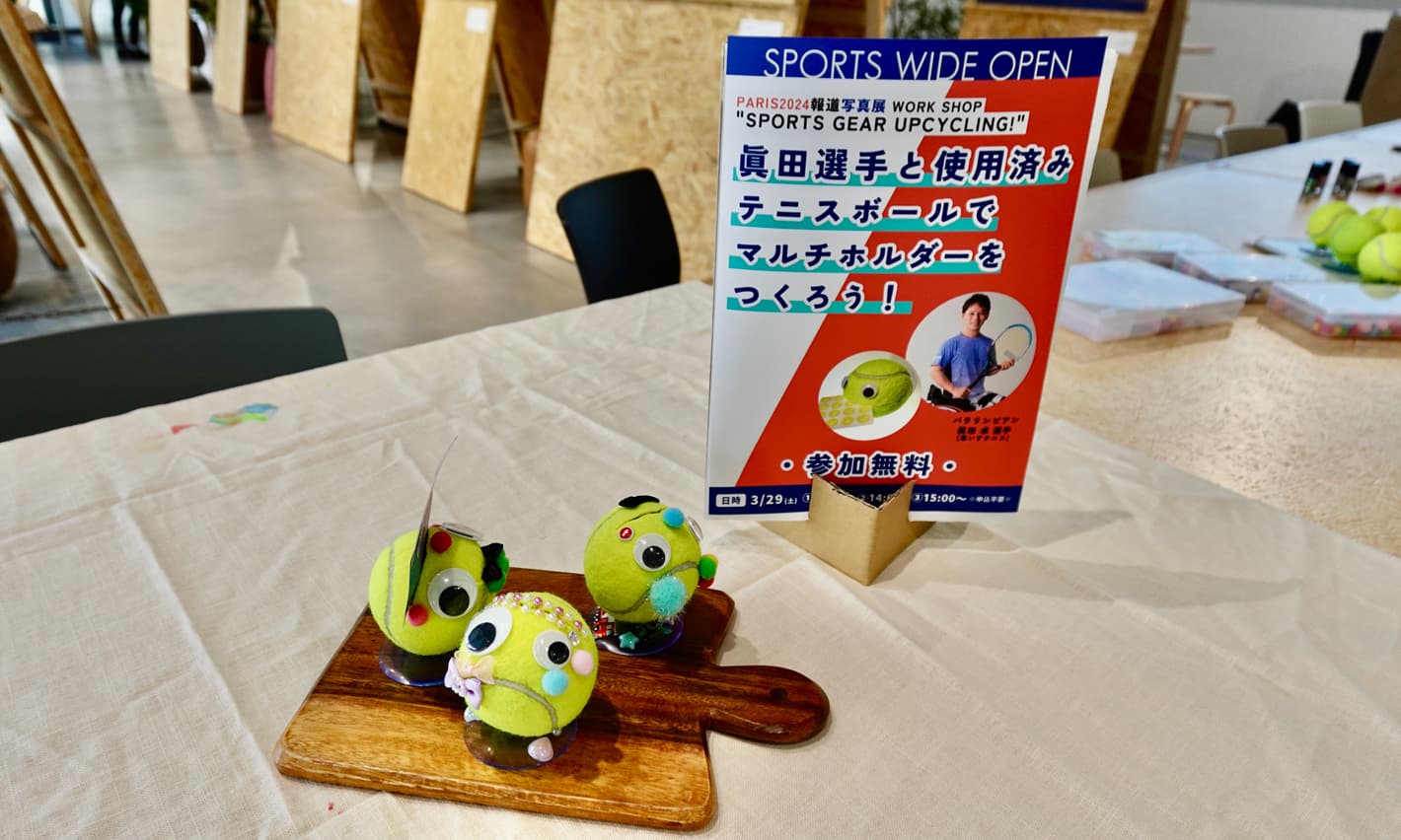 We held a workshop at PLAT UMEKITA in Osaka together with Takashi Sanada to upcycle used tennis balls. Participants had fun decorating tennis balls to create multi-holders, while learning about current circumstances and issues related to tennis balls—hundreds of millions are produced annually and most are discarded without being recycled. This provided an enjoyable opportunity to experience sustainability.