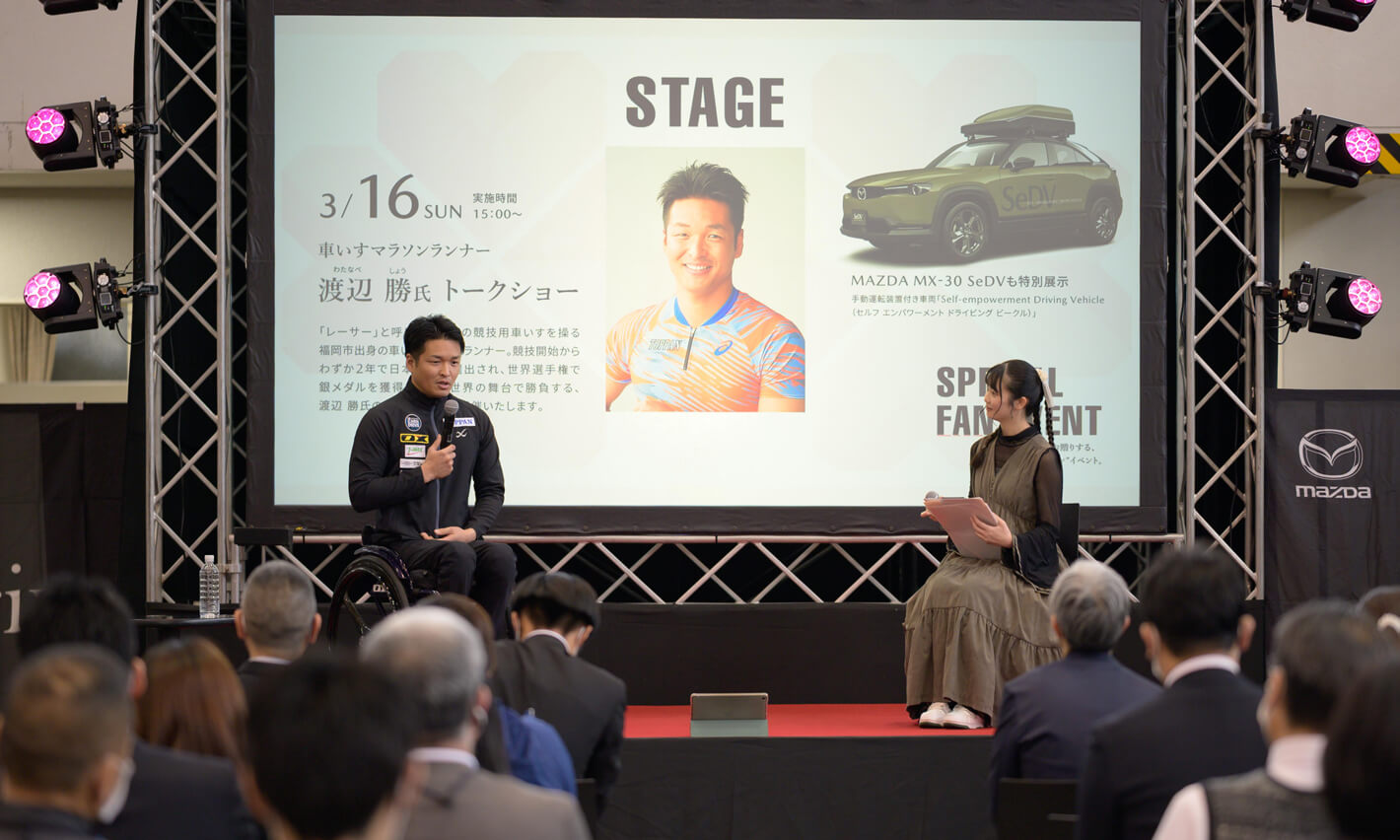 Our employee athlete Sho Watanabe (wheelchair marathon) appeared as a role model embodying the concept of "expanding the circle of living positively today" at the Kyushu Mazda Fan Event. He shared what inspired him to take part in wheelchair marathons and stories from competitions, providing participants with an opportunity to become more aware of diversity and to reflect on living positively.