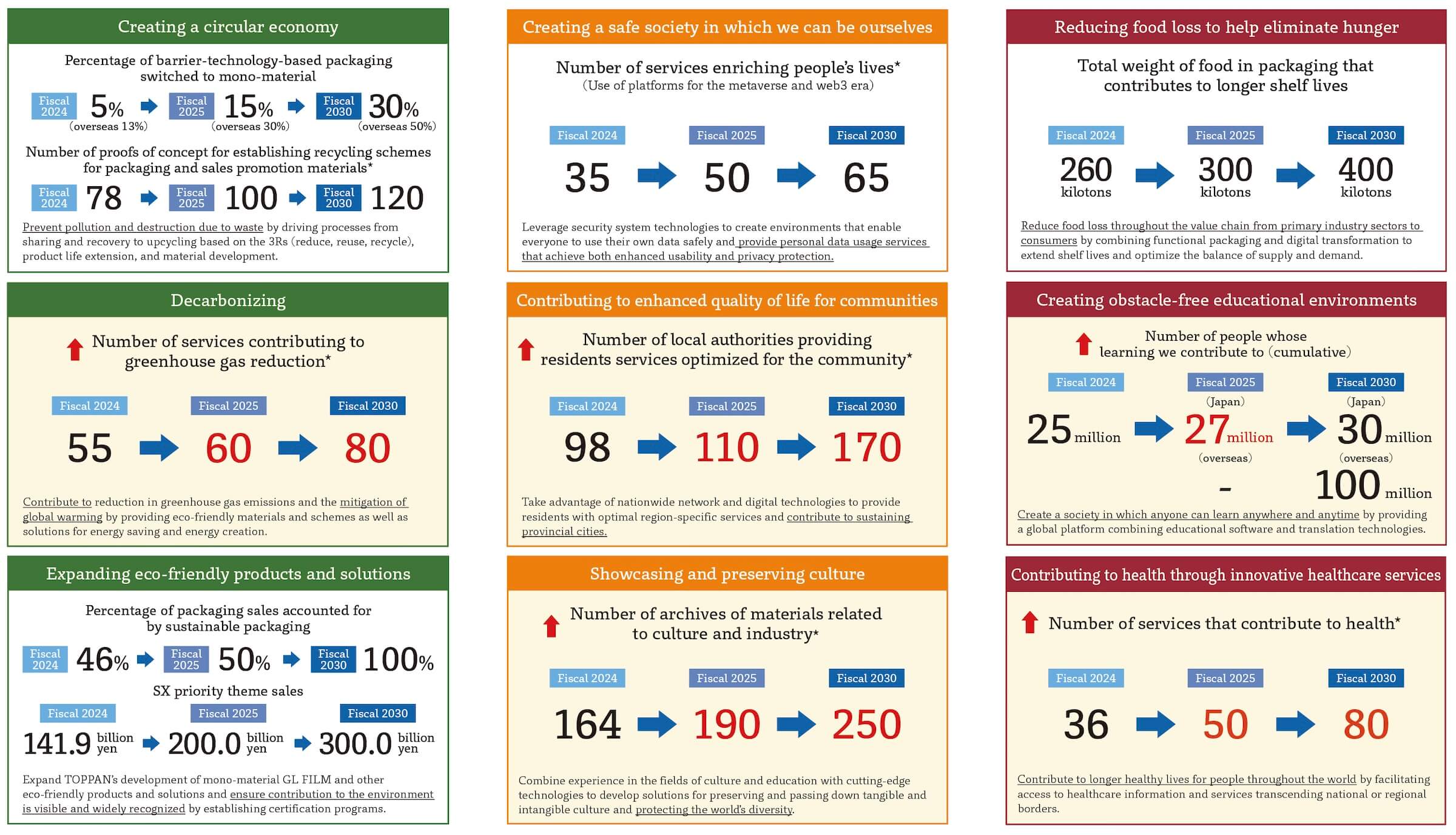 People are facing many issues today, including rising medical costs in developed countries with falling birth rates and aging societies, food shortages due to the growing world population, and challenges in educational environments due to ongoing social change. The TOPPAN Group is leveraging its strengths in development and manufacturing, including for healthcare-related services, functional packaging, and educational content, to provide services and products that support mental and physical fulfillment and systems for companies and other organizations to support the wellbeing of their people. These efforts contribute to empowering and fulfilling people in body and mind.