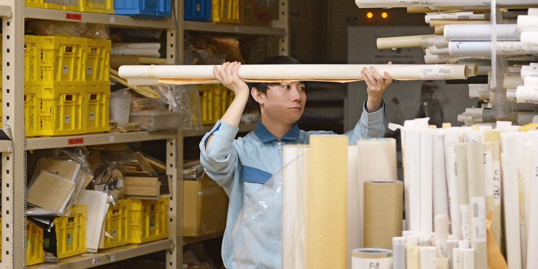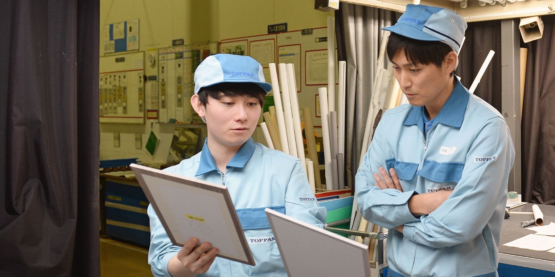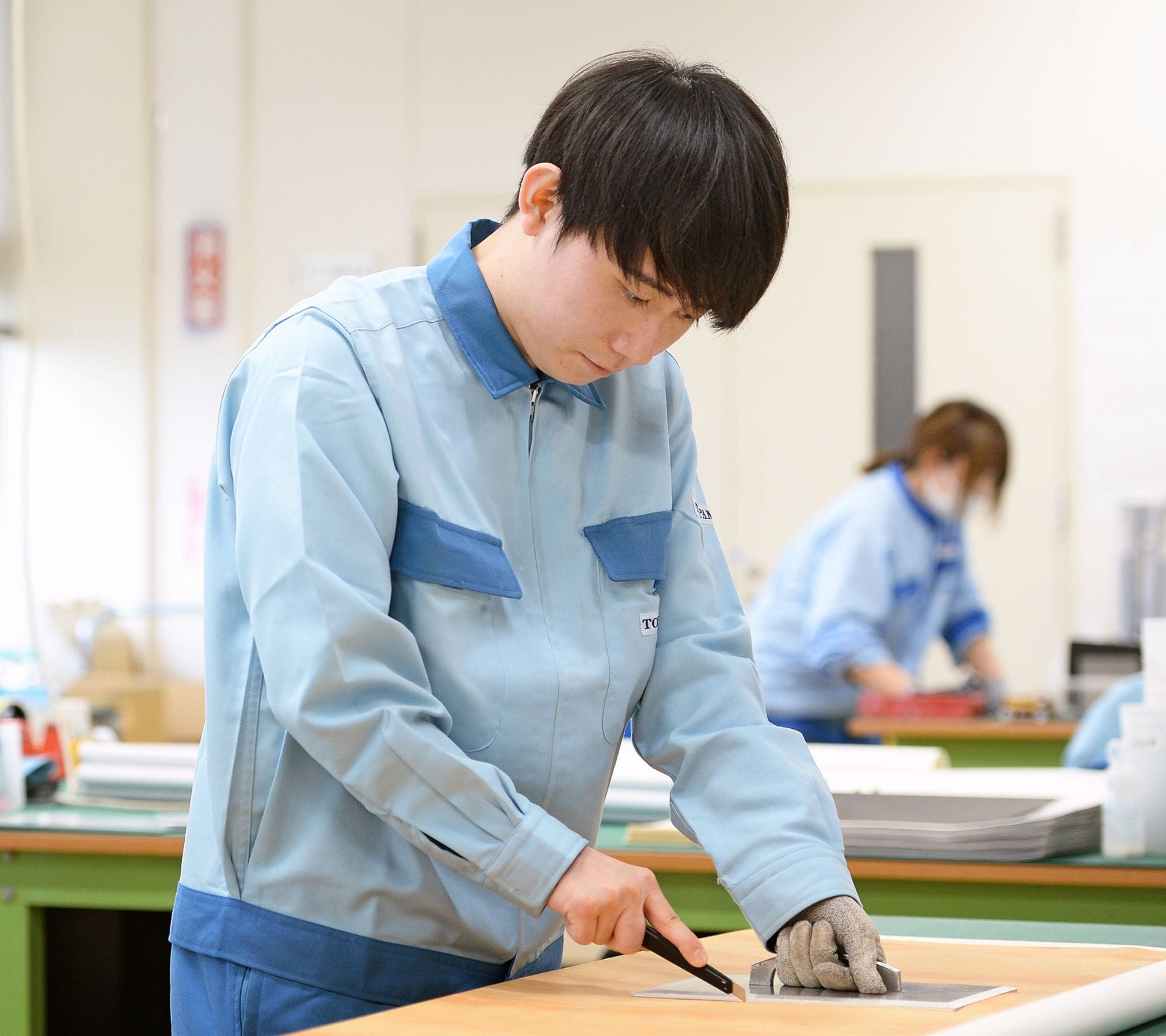 生産技術を担当しており、厚紙(チタン紙)、転写紙、壁紙の3品種を扱い、原価削減、品質トラブル対応、新製品開発を担っています。