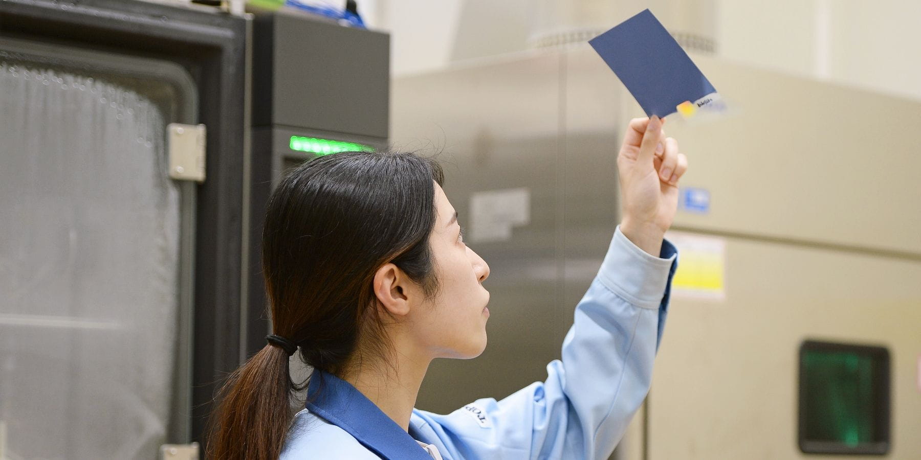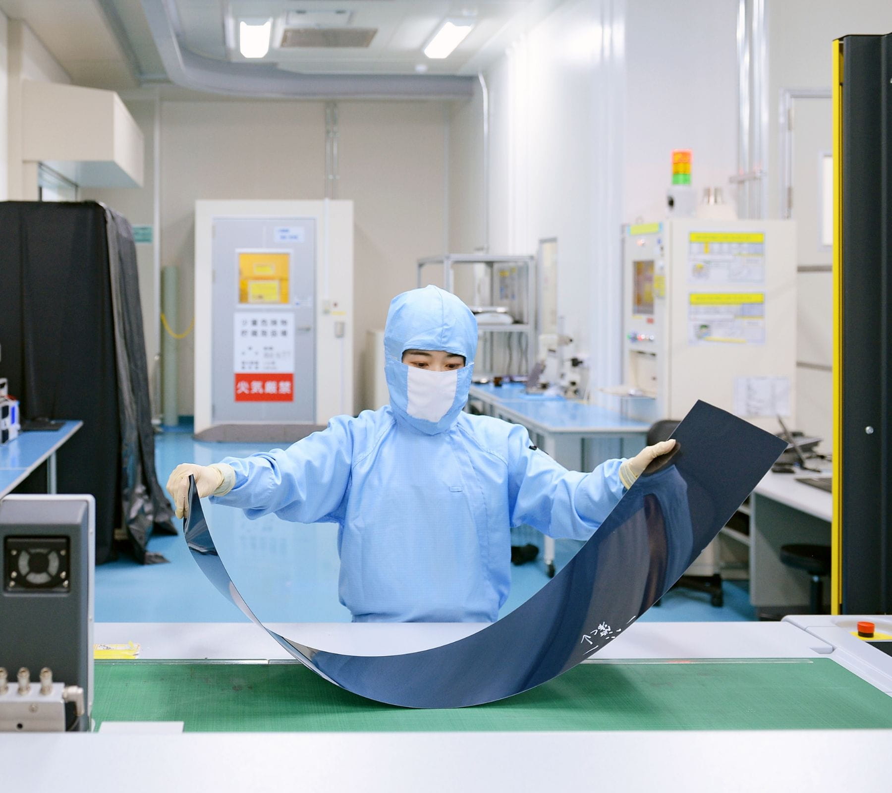 滋賀工場にて、調光フィルムの前工程における生産技術を担当しています。主に、新製品の量産立ち上げに伴う品質課題の改善や、生産条件の最適化、材料変更時の特性評価などを行っています。