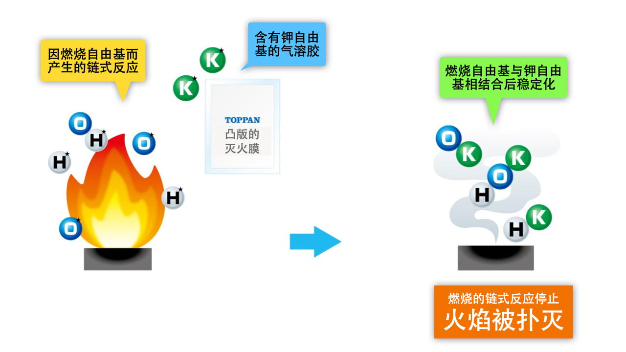 此次,在使用了Yamato Protec Corporation开发的具有高效灭火性能的灭火剂的基础上,更配以凸版印刷的透明蒸镀阻隔膜“GL BARRIER”的高水平涂布技术,成功解决了此类产品的耐久性低和施工难度大的问题,研制出只需贴附在有起火危险的地方即可有效发挥灭火作用的“灭火膜”。本产品体积小重量轻,可贴附于有起火危险的各种密封空间,如锂离子二次电池箱体内部、配电盘与分电盘的设备内部以及公共设施内的垃圾箱等。它对火的热度可立即作出相应反应,有效发挥灭火效能,抑制火势蔓延。