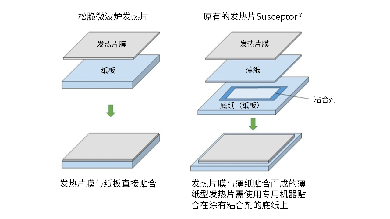 “Susceptor®”是一种薄纸型发热片,在PET薄膜上蒸镀一层铝膜后与薄纸贴合而成。在微波炉中使用时,它能够吸收微波,利用感应加热的原理将表面加热到200℃左右。其特点是无需使用火,即可在短时间内加热食物并烤出诱人的焦黄颜色。